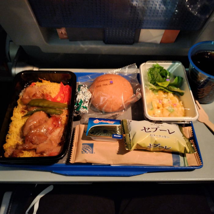 行きは東京から荷物を積むためか、日本人の口にあった機内食でした。