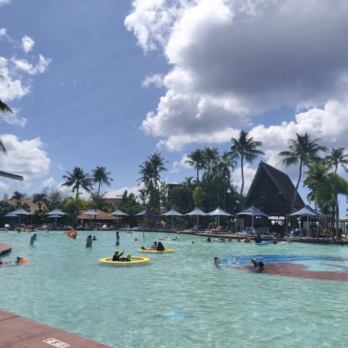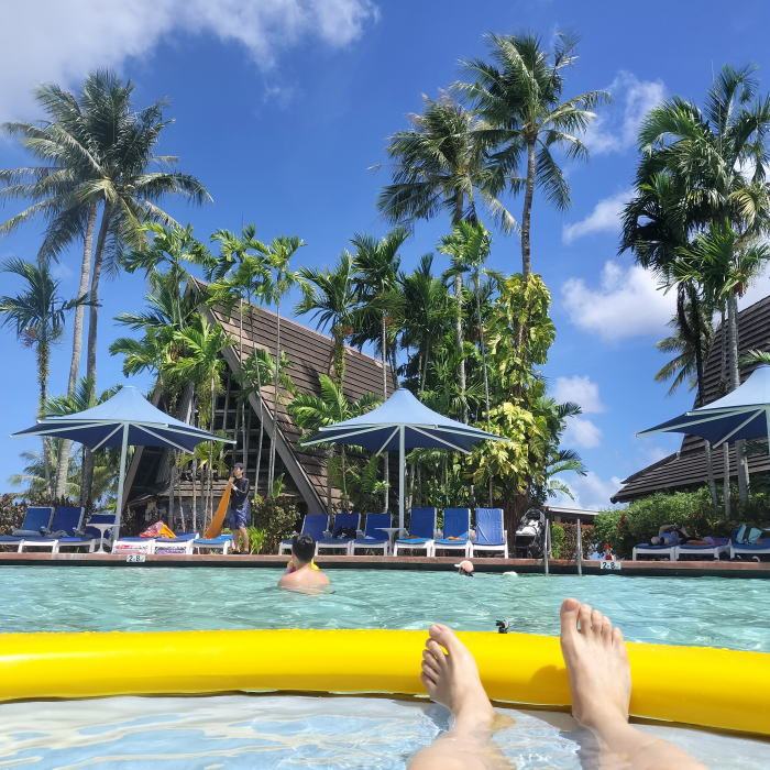 私はメインのプールに浮かんでいる大きな浮き輪でゆっくりくつろぎます、、、とはならず、娘に付き合ってヘトヘトになりました。このヤシの木と南国チックな建物は絵になりますね。