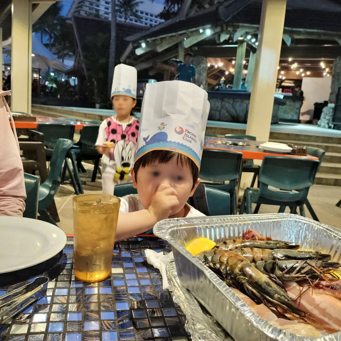 プールで疲れ果てた息子はウトウト。。。娘はまた隣のテーブルの年齢が近い娘さんがいる家族連れと仲良くなっていました。