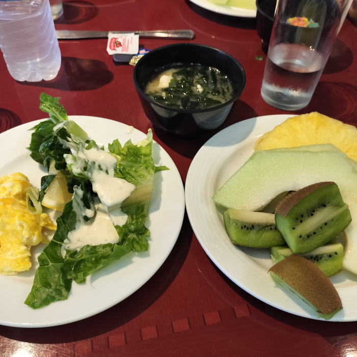 なんちゃってクラブルームで朝食。海外旅行は野菜が不足するので野菜を多く食べるようにしています。
