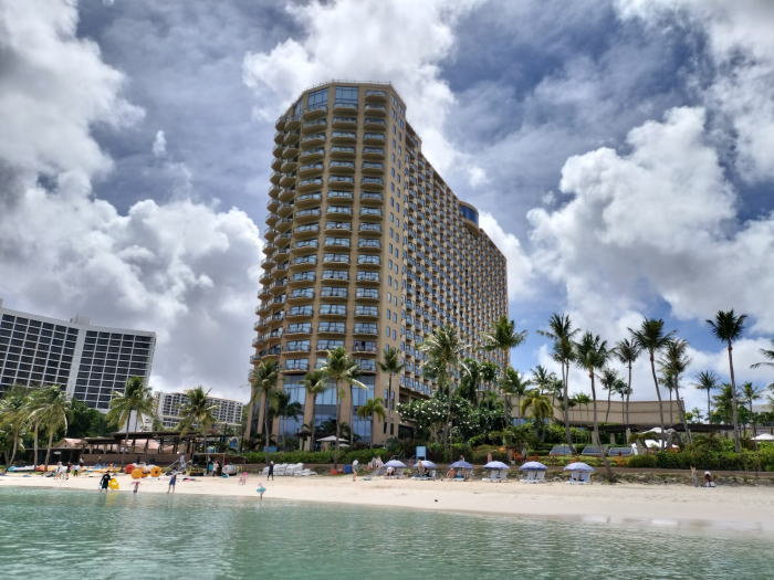 泊まるホテルは正面茶色い建物のデュシットビーチリゾートグアム(旧アウトリガーホテル)です。