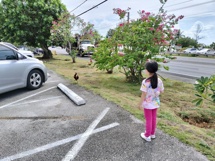 マリンパークの駐車場で野良ニワトリ発見。すたすたと速足で逃げていきました。